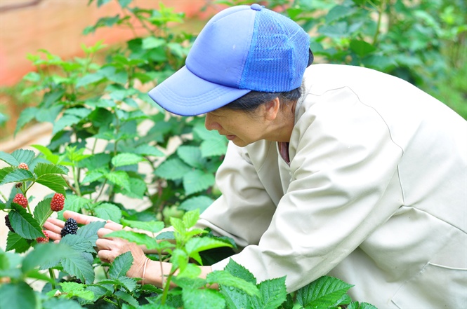 Bà Tôn Nữ Thanh Mỹ kiểm tra độ chín của trái phúc bồn tử.