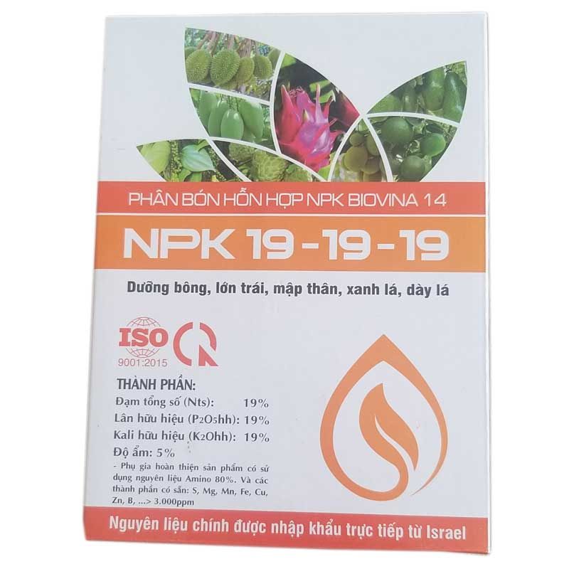 Thành phần: Đạm tổng số (Nts): 19%; Lân hữu hiệu (P2O5hh): 19%; Kali hữu hiệu (K2Ohh): 19%; Độ ẩm: 5%