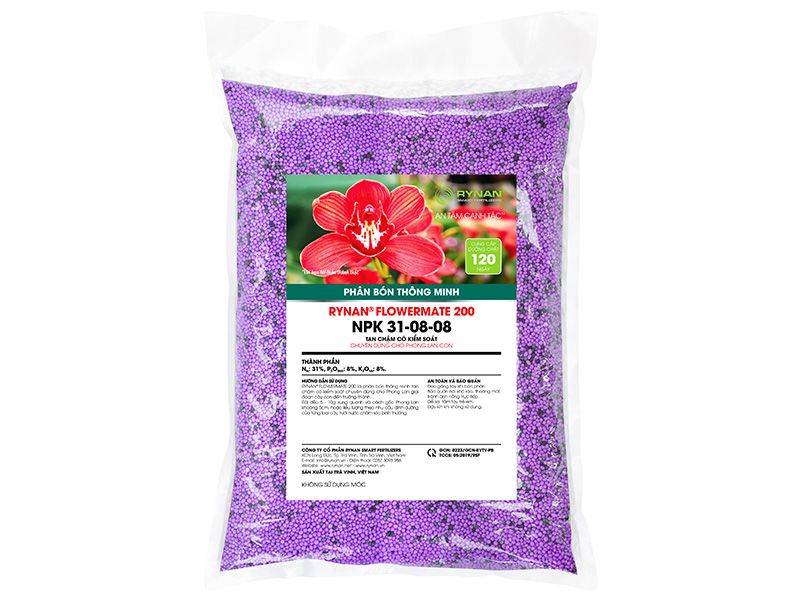 RYNAN® FLOWERMATE 200 là phân bón thông minh tan chậm có kiểm soát chuyên dùng cho phong lan. Cung cấp đầy đủ dưỡng chất cần thiết ở giai đoạn cây con, thời gian cung cấp dưỡng chất lên đến 120 ngày. Giúp cây sinh trưởng khỏe mạnh, tăng sức đề kháng, hạn chế nấm bệnh, kích thích mọc mầm, phát triển thân lá.